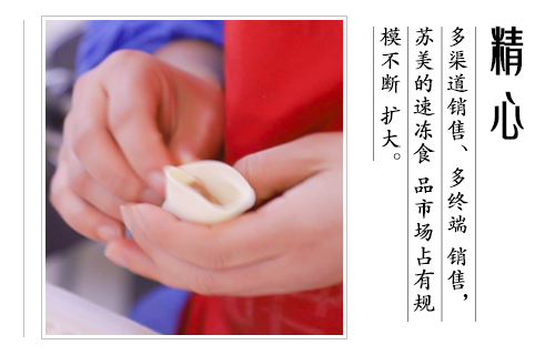公司產品涵蓋速凍水餃(含手工水餃和大餡水餃)、速凍餛飩、速凍湯圓等三個系列、30多個花色品種,主要產品在華東、華西、華北的市場占有率達18%以上,其中蘇美的芹菜豬肉水餃、韭菜雞蛋水餃以其獨特的口感,大受消費者好評,成為了新晉的網紅美食.
